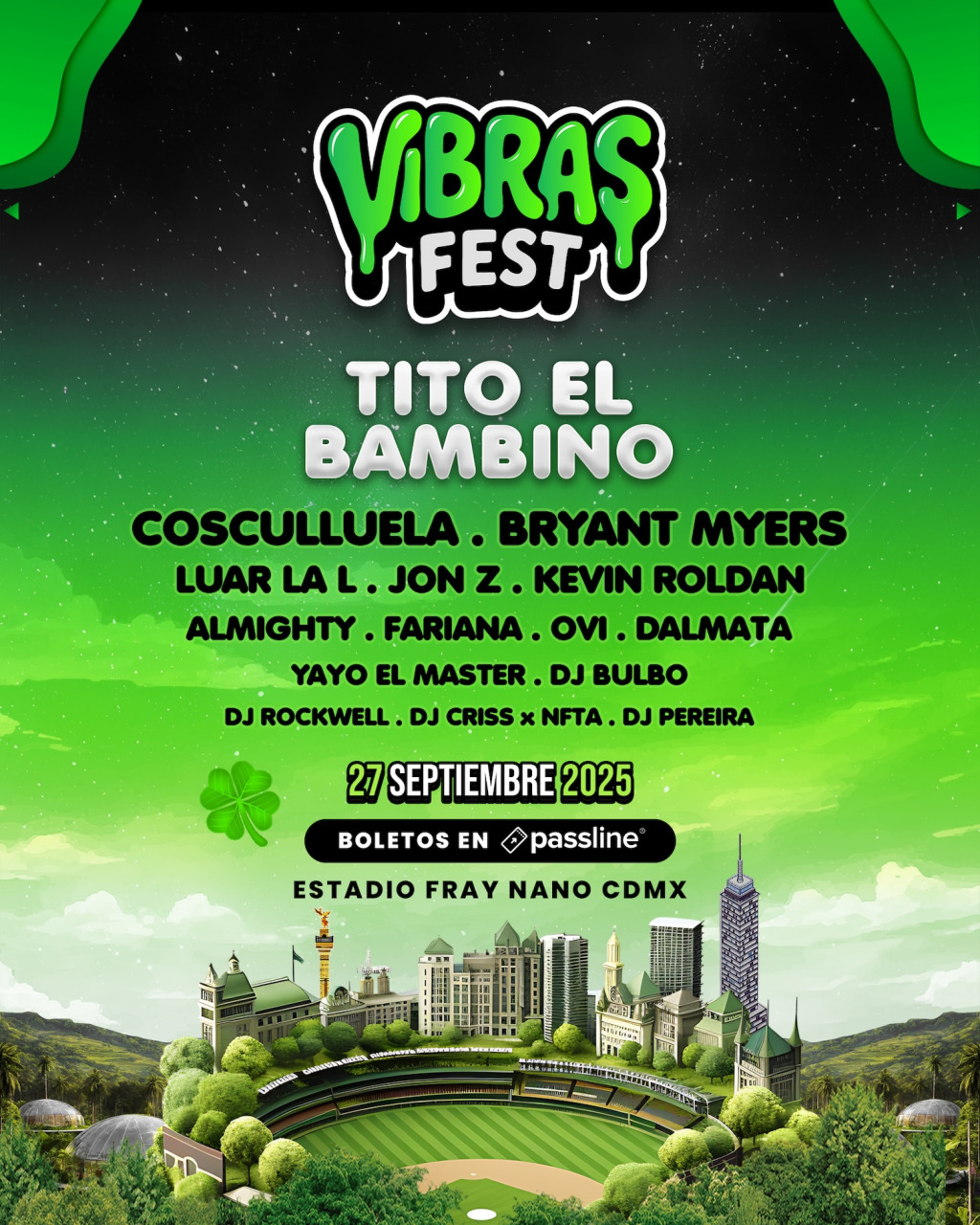 Vibras Fest es una nueva propuesta de festival de reggaeton para la Ciudad de México, que mediante una explosión de música urbana, flow y perreo hará vibrar a todos este 27 de septiembre de 2025 en el Estadio Fray Nano.