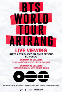 ¡ARMY! la espera terminó. BTS, uno de los fenómenos musicales más importantes del siglo XXI, vuelve a los escenarios internacionales de la mano de Trafalgar Releasings con su esperada gira mundial BTS WORLD TOUR ‘ARIRANG’, y Cinépolis +QUE CINE invita al fandom a vivir este histórico momento con dos funciones transmitidas en vivo desde Goyang (Corea del Sur), el 11 de abril, y Tokio (Japón), el 18 de abril de 2026. La preventa Cinépolis ya está disponible.