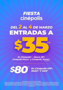 Cinépolis invita al público a vivir la experiencia de sus salas y su cartelera con el regreso de Fiesta Cinépolis, una celebración especial de promociones que se llevará a cabo del 2 al 4 de marzo de 2026.Es una oportunidad para que más personas disfruten de sus películas favoritas en distintos formatos, desde funciones tradicionales hasta experiencias inmersivas, como IMAX® y 4DX®, con precios especiales por tiempo limitado.