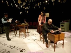 Aprovechando la estructura del teatro El Granero, el público puede apreciar una obra tan intimista; al tener tan cerca a los actores y a las actrices uno puede sentir claramente por lo que están pasando y se aprovecha al máximo los elementos que hay en escena. Una mesa al centro con sus respectivas sillas, una mesa pequeña y sobre ella una máquina de escribir, una estufa y un mueble de la cocina, una carriola, un tocadiscos, una tabla ouija y en el techo hay distintos papeles con textos que van siendo leídos por los personajes para jugar y descubrir a quién le pertenecen los textos leídos.